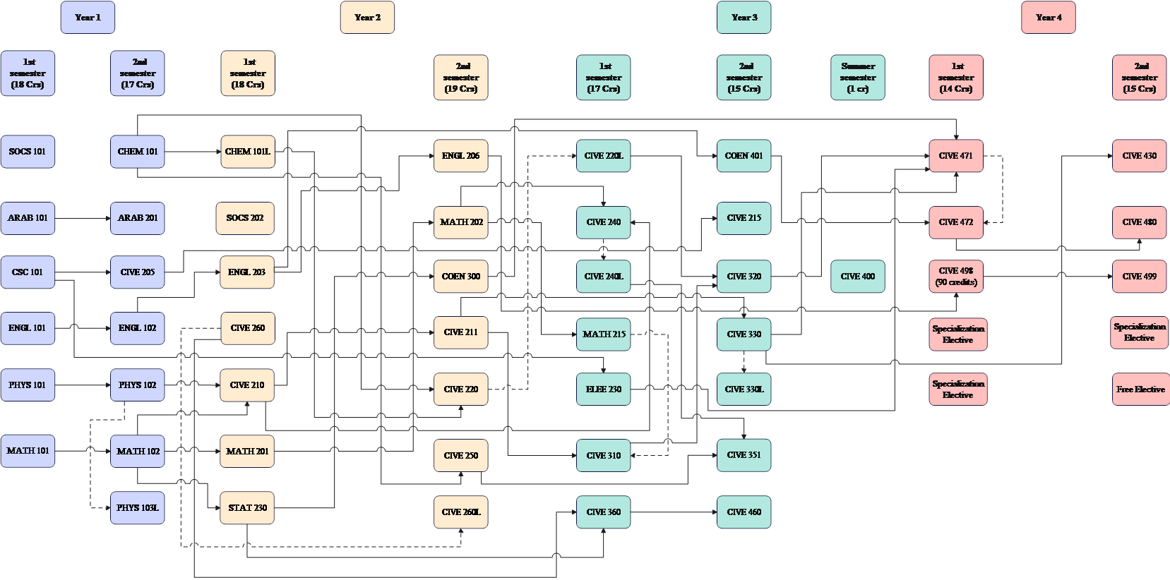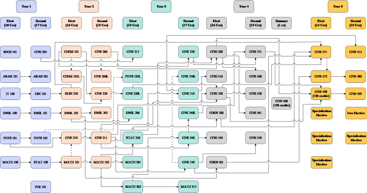 To graduate with a bachelor’s degree in civil engineering (BCE), students must satisfactorily complete 159 credit hours. The distribution of courses in the proposed study plan is as follows:
